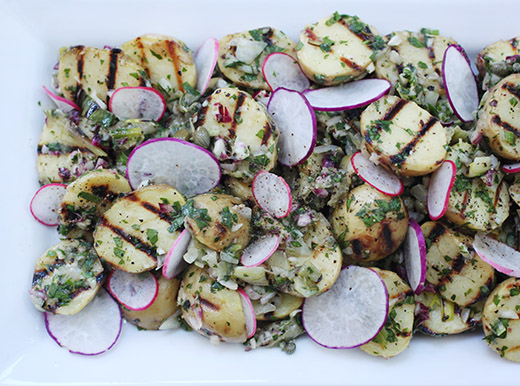 If you love to throw parties and are amazing at it or if you’d like to get better at doing it, I have a new book for you. Life Is a Party: Deliciously Doable Recipes to Make Every Day a Celebration from David Burtka is full of festive ideas, and I received a review copy. And, you can win a copy! Just leave a comment on this post before the end of Monday, May 6th including an email address where I can contact you. Two randomly selected winners in the US or Canada will each receive a copy of the book from the publisher. The book begins with handy party planning tips like setting the mood by testing lighting the day before, stocking up on plenty of ice and storing it in the bathtub or washing machine, checking with guests about any food allergies, and more. My favorite of the tips, and one that I live by, is getting as much done in advance as possible. You should enjoy the party too! Then, the party menus are grouped by season. But, there’s more than just menus and recipes. There are also suggestions for table decor, what to wear, how to take the theme to the next level, activities, and even a playlist for each occasion. Everything you need for an incredible party is here, but this is an easy-going book. You’re invited to pick and choose how much you want to do and how you want to shape your party. The recipes tend to serve six to eight, and you can scale up or down as needed. Each menu includes cocktails or mocktails, salads or sides, main dishes, and dessert. Of course, you could also mix and match recipes to create your own menus too. As soon as I opened the book, the Scallops with Peas and Green Oil got my full attention. It’s part of a spring party menu that starts with a Cucumber-Herb Cocktail and ends with a Flourless Chocolate Cake. The Mexican Fiesta looks like a lot of fun, and I would love to find big serving bowls of guacamole and ceviche at a party. I also loved the look of the Chocolate Chunk Hazelnut Bars and the pitcher of Fresh Blueberry Fizz at the Summer Picnic. It was the Sunday Funday menu that got me headed into the kitchen though. It starts with Mojito Slushies and includes Grilled Tofu Skewers with Coconut-Peanut Dipping Sauce, a DIY Sundae Bar, and the Grilled Potato and Leek Salad shown here. I did fall for the idea of grilling potatoes for a potato salad, but in truth, I can never pass up salsa verde of the Italian variety. The herby sauce with olive oil sounded like a perfect match for grilled potatoes. I used small, white potatoes, and they were boiled and allowed to cool before grilling. I opted for a grill pan on top of the stove for better heat control with the small potatoes and leeks and onions. I had a collection of local spring bulb onions and leeks, and I had just brought home some shallot scapes that I used here as well. The onions and leeks were halved lengthwise, brushed with oil, seasoned with salt and pepper and grilled on the pan until tender. The cooled potatoes were sliced in half, oiled, seasoned, and grilled for a few minutes on each side. The vinaigrette was made with mustard, white wine vinegar, olive oil, parsley, cilantro, and I added capers. I chopped the grilled onions and leeks because I prefer them finely chopped. They were added to a big bowl with the grilled potatoes to be tossed with the vinaigrette. The salad was garnished with sliced radishes.