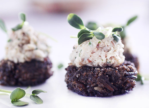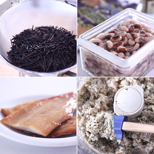 To make the wild rice cakes, you first need cooked wild rice. I sometimes have some in my freezer, but not this time. I cooked enough to use for this recipe and to freeze a bit for another day. The cooked wild rice is re-cooked until very soft, and then it’s drained and pureed in a food processor. The resulting dough is then mixed with salt and some cooked wild rice that was reserved before pureeing before being shaped into patties and fried on each side until browned. For the Smoked Whitefish spread, you need some cooked beans, and in this case my freezer came through for me. I had stored away some yellow-eye beans that worked well here but just about any type of bean would be fine. Smoked white fish was prepped by removing the skin and flaking the fish. I started by pureeing the beans in the food processor since they should be made smooth, then I pulsed the fish with some salt, oil, and ground sumac. I wanted the fish to retain some texture. The fish and bean spread was spooned onto the crispy wild rice cakes and topped with some sunflower sprouts.