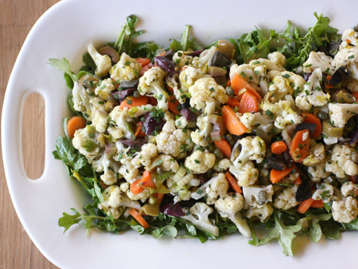 I cut a head of cauliflower into florets, tossed the florets with several cloves of garlic, chopped fresh sage, olive oil, and salt and pepper, and roasted all for 30 minutes. For the last few minutes of roasting, I pushed the cauliflower and garlic to the side of the baking sheet and added some pine nuts. In a very large mixing bowl, the cooked and drained farro joined rinsed and drained, canned white beans, zest from one lemon, a big handful of chopped parsley, a little bit of chopped sage, the roasted cauliflower, garlic, and most of the pine nuts, and a quick vinaigrette of lemon juice and olive oil. This was seasoned with salt and pepper and just a shake or two of crushed red pepper flakes. Once on the plate, it was topped with crumbled goat cheese, a few more pine nuts, and chopped parsley as garnish.