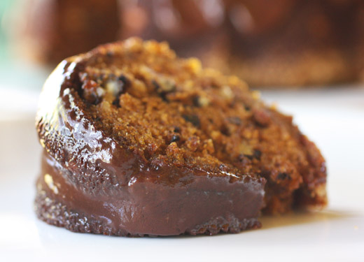 As I said, this was a delightfully tender-crumbed cake. The pumpkin puree keeps it that way, and the walnuts added flavor and crunch. The chocolate ganache was completely optional, but it was such nice, subtle added touch on top, I’ll definitely include it again next time. Due to the unanimous thumbs-up review, I’ll be baking another one of these cakes for Saturday’s bake sale.