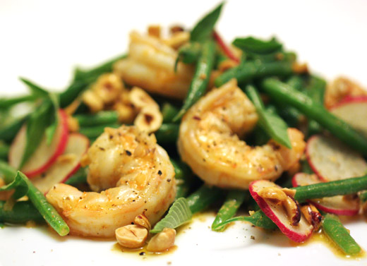 I prepared the salad and let it sit in the refrigerator as the rest of the meal was put together, and it emerged cool and crisp with well-distributed flavor. I wished I had some Thai basil to use in this, but the genovese variety worked perfectly fine. The salad was delightfully crunchy with a good variety of tastes and textures. The spice level was mild, but the chile added another dimension. It was a nice surprise to find out how satisfying this salad was given its lightness. With bright, fresh flavors, good crunch, and the nuttiness, it didn’t require anything else to make it great.