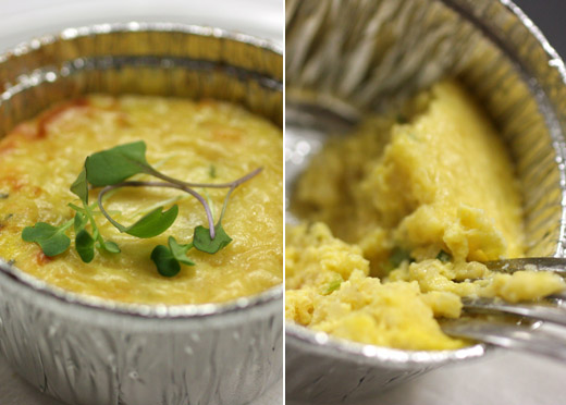 To serve, make a salad of the white and red quinoa, toasted almonds, shaved raw cauliflower (use small inside florets) and snipped chive. Season with rice wine vinegar, fruity olive oil, salt and pepper. Don’t make the salad acidic – use the vinegar only to brighten up the earthy/nutty tones. Dispense a bit of the cauliflower puree in the bottom of the bowl. Cover with the salad, and top with popped sorghum.