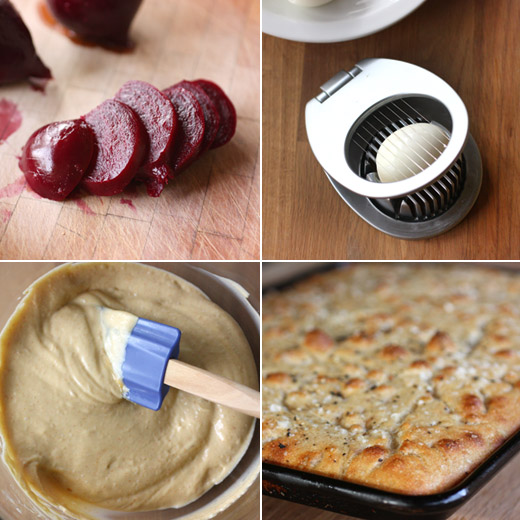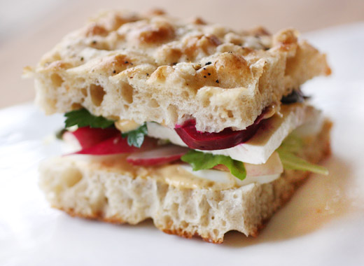 The unbaked biscuits can be stored in the freezer and baked just when needed. Or, if going the Angel Biscuit route, after the dough rises it’s then stored in the refrigerator for up to three days before being flattened, cut, and baked. Flour, baking powder, and salt were combined, and cold butter pieces were worked into the flour by hand. Hard-cooked egg yolks were pushed through a sieve and added to the flour mixture. The cooked yolks contribute to a more tender result since they mix into the dough without causing it to become gummy or possibly overworked. Cream was added next, and I added yeast as well. The dough was stirred together and left to rise for an hour and a half. Then, the covered bowl was placed in the refrigerator until ready to bake. I always get greedy when I make biscuits. I cut them into squares with a knife rather than using a biscuit cutter. I don’t want to waste any dough or have to handle it more for re-rolling. In this case, I got extra greedy because I wanted the biscuits to be wide enough to make a good breakfast sandwich. I rolled the dough a little thinner than I normally would and ended up with slightly shorter biscuits. I brushed the tops with extra cream and sprinkled on some flaky sea salt. To make the breakfast sandwiches, I made a vegetable frittata with local sun gold tomatoes and squash. I cut the frittata into squares and topped the squares with basil pesto and arugula in each biscuit.