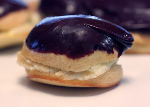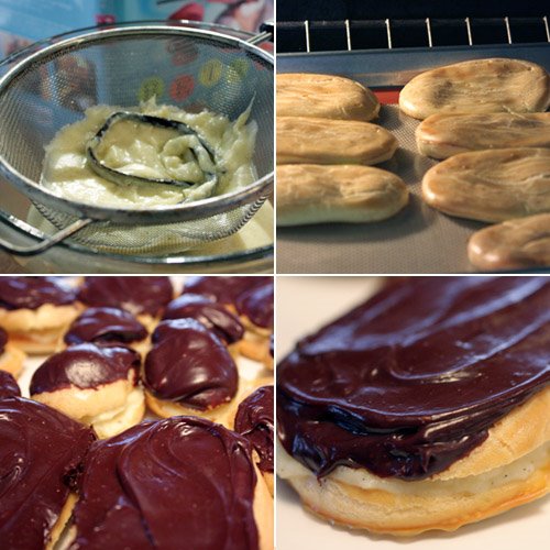 I had made pate a choux, vanilla pastry cream, and chocolate glaze before, but I had never made them all at the same time in the form of an eclair. I decided it was high-time I do so, and I grabbed Wayne Harley Brachman’s Retro Desserts for a recipe to follow. I’ve had this book since it first came out in 2000, and it’s full of fun, well-known desserts with everything from cakes and pies to ice creams and candies. The book is described as bringing together kitsch desserts for today’s kitchens and letting you make your remembered favorites entirely from scratch. The cream-filled devil’s food cupcakes bring back Ho Ho’s. I’ve never had cherries jubilee, but it’s in the book too. I’ve made the banana pudding which was fantastic, and I’ve always wanted to try the banana peanut butter sandwich cake. Then, there’s the rocky road pizza pie and the white-chocolate grasshopper pie to try. I could go on and on, but I was explaining about the eclairs.